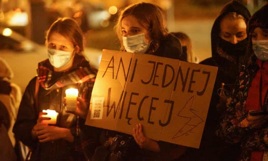 A woman holds a banner saying ‘Not one more!’ as people protest against changes in the abortion law in front of the ruling Law and Justice party office in Gdansk. Photograph: Michał Fludra/NurPhoto/REX/Shutterstock